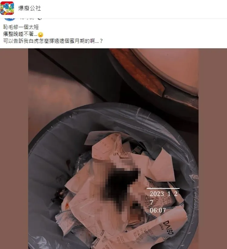 這名男網友在臉書「爆廢公社」發文表示,恥毛修一個太短,癢整晚睡不著,他發問說:「可以告訴我白虎怎麼撐過這個蜜月期的啊…?」發文時間是清晨6點7分,還附上自己修剪完後棄置垃圾桶內的「殘骸」照片。