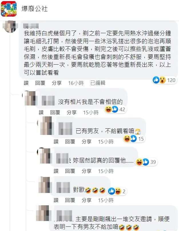 沒想到有女網友大方回覆,「我維持白虎幾個月了,剃之前一定要先用熱水沖過幾分鐘讓毛細孔打開,然後使用一些沐浴乳搓出很多的泡泡再順毛剃,皮膚比較不會受傷,剃完之後可以擦些乳液或蘆薈保濕,然後重新長毛會發癢也會刺刺的不舒服,要馬堅持最少兩天剃一次,要馬就乾脆忍著等他重新長出來,以上可以嘗試看看」。結果爆量湧入的交友邀請,讓她不得不再留言說,「已有男友,不給觀看唷」、「主要是剛剛飆出一堆交友邀請,順便表明一下有男友不給加唷」。