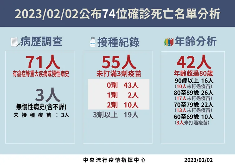 針對死亡個案,指揮中心指出,今日新增74例本土病例死亡個案,為44例男性、30例女性,年齡介於60多歲至90多歲以上,皆屬重度感染、71例具慢性病史、55例未接種3劑以上COVID-19疫苗。確診日介於去(2022)年12月29日至今(2023)年1月30日,死亡日期介於今年1月17日至1月30日。