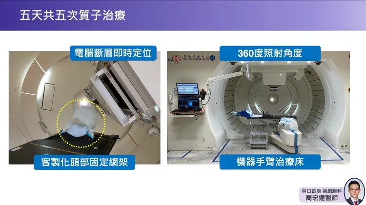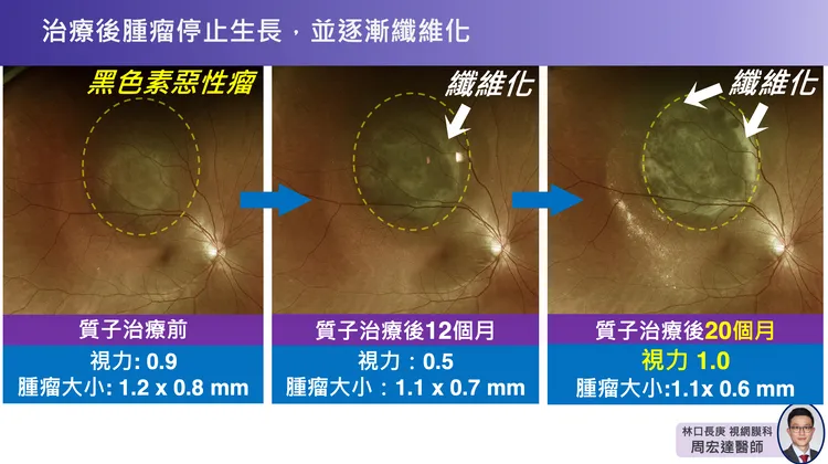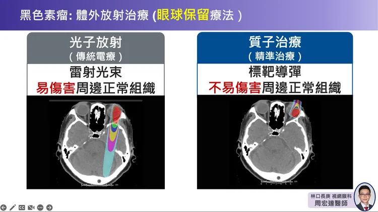 林口長庚醫院眼科部視網膜科主治醫師周宏達則說,眼球對輻射副作用的容忍程度低,因此精準的質子治療,被譽爲是眼球黑色素瘤的「黃金治療」,歐美大型研究也指出,使用質子治療眼內黑色素瘤約1至2周後,原發腫瘤控制比例超過90%,眼球保留比例75%至93%,且有高達3至4成的病人視力得以保留。