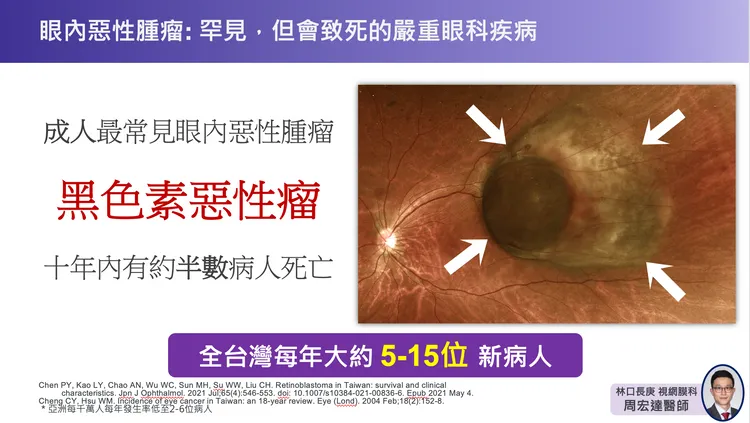 林口長庚眼科部部主任黃奕修說,一般黑色素瘤較常生長於皮膚,但因眼睛也有黑色素細胞,因此黑色素瘤也有可能在眼球內或眼球周邊生長,最常見的治療手法就是將眼球摘除,只要腫瘤厚度超過0.3公分就有能力轉移,且早期的轉移沒有辦法偵測,因此目前使用的任何治療,包括眼球摘除,都無法降低死亡率,仍有半數患者會在10年內死亡。