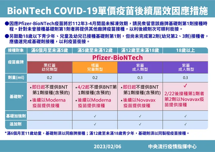 針對BNT疫苗相關接種年齡規定,莊人祥表示,滿6個月至11歲幼童,基礎劑須以同廠牌接種、滿12歲至未滿18歲青少年,基礎劑則須以同製程疫苗接種,故因應年齡層限制不同,指揮中心也宣布調整疫苗基礎劑相關接種規定,並已在2/4發布公文予各地方衛生局轉告醫療院所。
