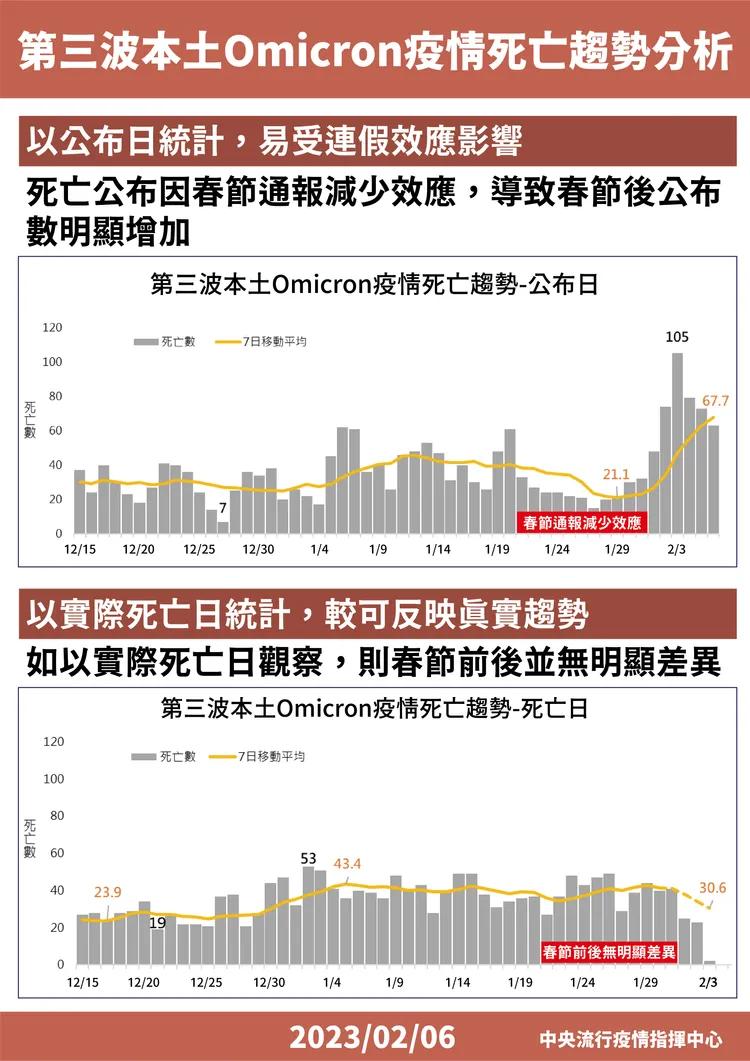 指揮中心指揮官王必勝則提醒,解讀數字可能會將短時間、高峰期拿出來評論,但死亡人數是落後指標,2/1到2/5反應的是前面疫情高峰的狀況,不能反應當下真實狀況,如此解讀可能會有失真問題,建議以長時間來看。