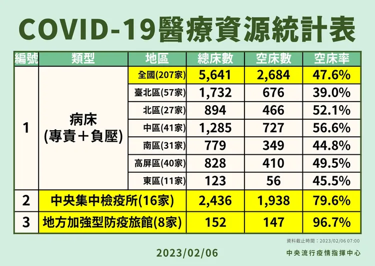 指揮中心今公布,全國專責病床總床數5641、空床數2684、空床率47.6%;各區空床率則分別為,台北區39%、北區52.1%、中區56.6%、南區44.8%、高屏區49.5%、東區45.4%。
