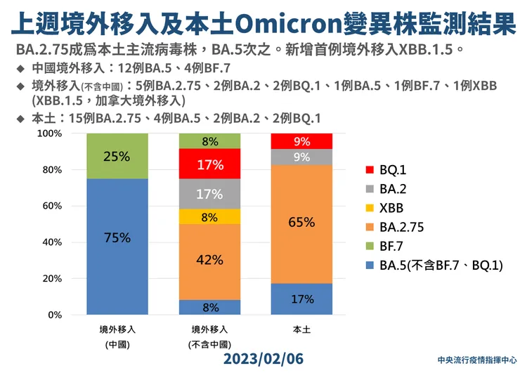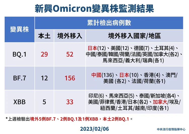截至目前國內累計檢出之Omicron亞型變異株境外移入確定病例:BA.5為1,564例、BA.2為1,034例、BA.2.75為167例、BF.7為156例、BA.4為104例、BQ.1為52例、XBB為33例;另累計本土確定病例:BA.5為1,614例、BA.2為2,540例、BA.2.75為107例、BQ.1為29例、BF.7為12例、XBB為5例、BA.4為5例。