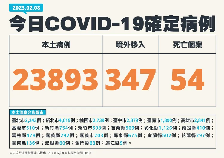 針對死亡個案,指揮中心指出,今日新增54例本土病例死亡個案,為34例男性、20例女性,年齡介於40多歲至90多歲以上,皆屬重度感染、50例具慢性病史、38例未接種3劑以上COVID-19疫苗。確診日介於去(2022)年12月24日至今(2023)年2月3日,死亡日期介於今年1月20日至2月4日。
