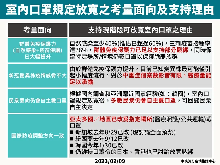 指揮中心宣布,自2/20起室內戴口罩將分為「要求全程佩戴」、「建議配戴」、「民眾自主決定」等3層次,但各級學校、幼兒園、課照中心、補習班、托嬰中心等要3月6日才會實施新措施。