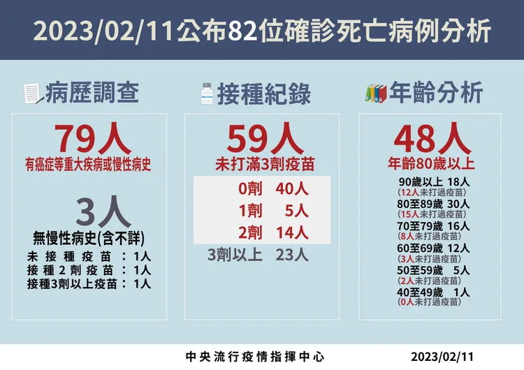 針對死亡個案,指揮中心指出,今日新增82例本土病例死亡個案,為53例男性、29例女性,年齡介於40多歲至90多歲以上,皆屬重度感染、79例具慢性病史、59例未接種3劑以上COVID-19疫苗。確診日介於去(2022)年10月20日至今(2023)年2月7日,死亡日期介於去年10月24日至今年2月8日。