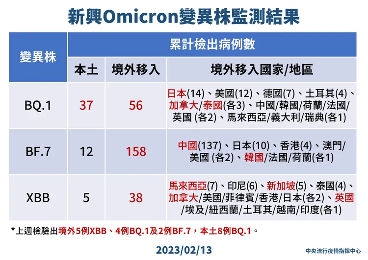 指揮中心補充,截至目前國內累計檢出之Omicron亞型變異株境外移入確定病例:BA.5為1,569例、BA.2為1,035例、BA.2.75為177例、BF.7為158例、BA.4為104例、BQ.1為56例、XBB為38例;另累計本土確定病例:BA.5為1,628例、BA.2為2,540例、BA.2.75為140例、BQ.1為37例、BF.7為12例、XBB為5例、BA.4為5例。