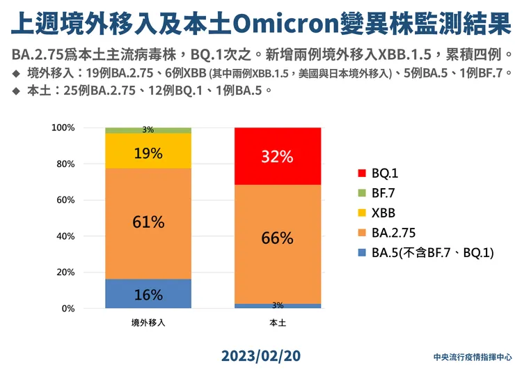 指揮中心表示,今公布69例Omicron變異株檢驗結果,其中本土共38例,包括BA.2.75共25例(66%),BQ.1共12例(32%),BA.5僅1例(3%),其中BQ.1自上週的15%提高為本週的32%,BA.2.75則自上週的60%上升為66%;境外31例則包括19例BA.2.75、6例XBB、5例BA.5、1例BF.7,且XBB個案中,包括2例XBB.1.5,分別自日本、美國入境。