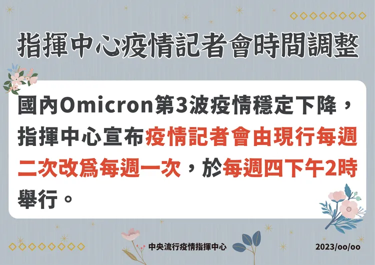 而隨著國內第三波Omicron疫情穩定下降,指揮中心今(2/20)宣布,未來疫情記者會將由現行每周一、四舉行,調整為只剩下每周四下午2時舉行,如有緊急狀況或臨時政策宣布,會再另外通知。