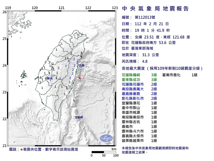 【記者陳明萱/台北報導】今19時01分在台灣東部海域發生規模4.8地震,震央約在花蓮縣政府南方53.6公里,深度約31.3公里,最大震度花蓮、台東3級。
