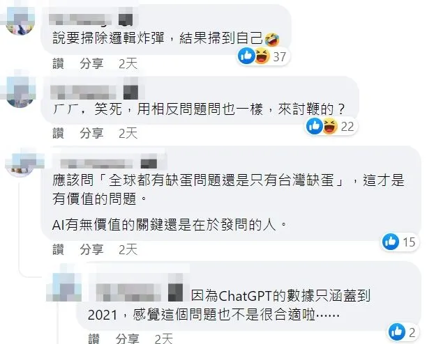 但也有人駁斥,「ㄏㄏ,笑死,用相反問題問也一樣,來討鞭的?」、「建議你還是兩種問法都問過再來貼文,很明顯還對ChatGPT不熟」、「用錯誤的問法來得到想要的答案」、「說要掃除邏輯炸彈,結果掃到自己」、「同樣的問題倒過來問,答案一樣,自己買不到蛋就是缺蛋,這樣邏輯也是有問題」、「不同的問法會導出恰好相反的答案,以此推論為證毫無意義」、「因為ChatGPT的數據只涵蓋到2021,感覺這個問題也不是很合適啦」。