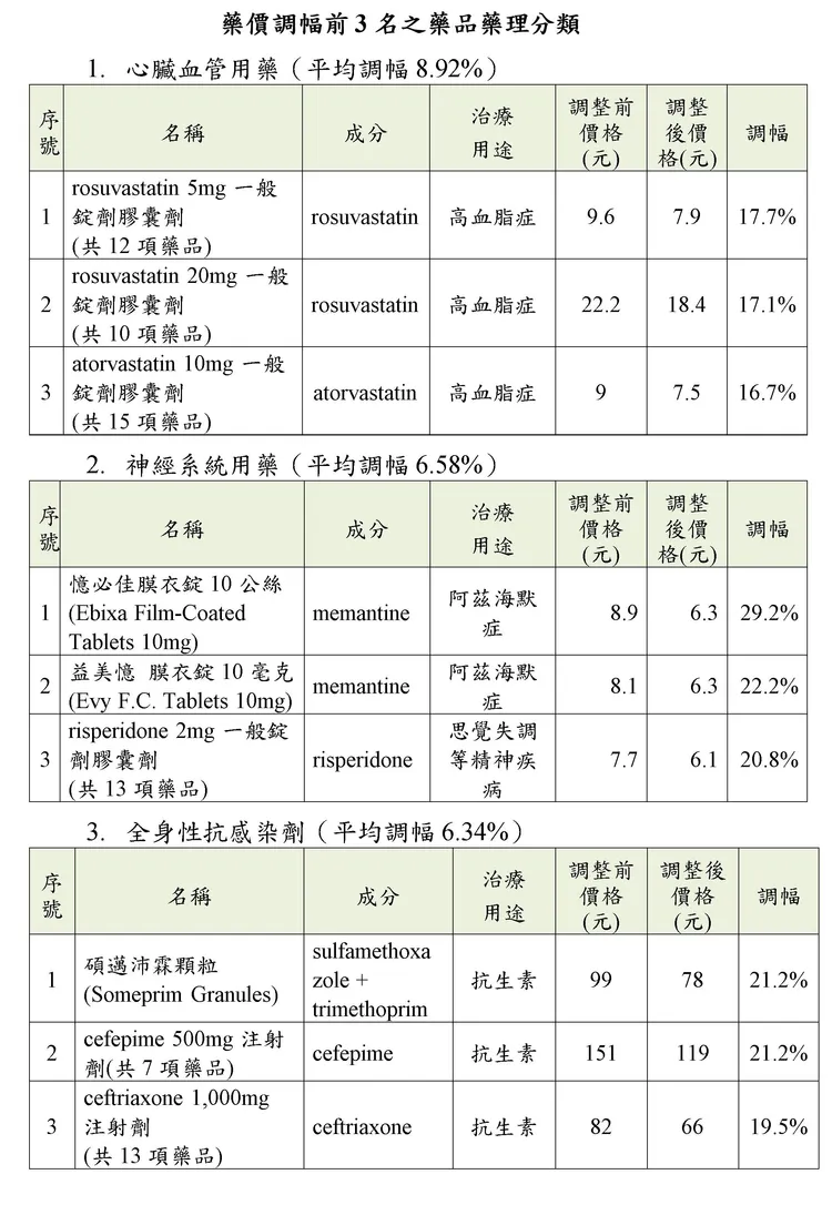 為確保供藥穩定、加上藥品短缺事件,健保署今年首度施行一個品項不調整,同分組的同成分、同含量、同劑型都不調整。健保署統計,今年調降幅度最大的前三名分別為心血管用藥、神經系統用藥以及全身抗感染劑用藥,平均降幅依序為8.92%、6.58%與6.34%。
