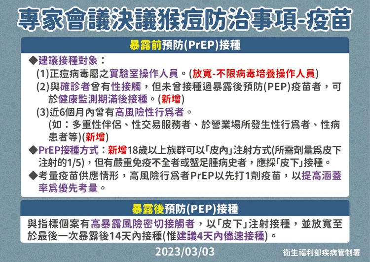疾管署說明,因應放寬猴痘疫苗 PrEP接種對象將再採購疫苗,並就疫苗管理與接種實務等,與地方政府衛生局、民間社群團體等討論後規劃辦理相關接種作業。