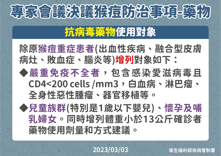 二、 新增猴痘抗病毒藥物使用對象,除原猴痘重症患者(包括:出血性疾病、融合型皮膚病灶、敗血症、腦炎等)增列對象如下: