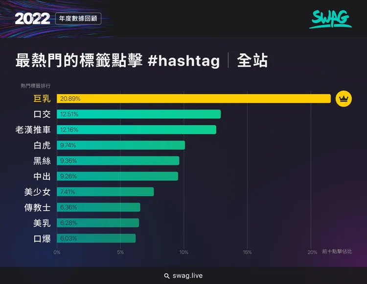 八、2022 年 SWAG平台 111 種標籤裡,「巨乳」的點擊次數獨佔鰲頭,且遙遙領先第 2 位的「口交」達 1.67 倍,平均每 6 位紳士就有 1 位拜倒在奶香味下。「巨乳」也橫掃全球榜單,不論在世界何地都穩坐前三名寶座,驗證了「乳巨,定能聚人心」的真理。