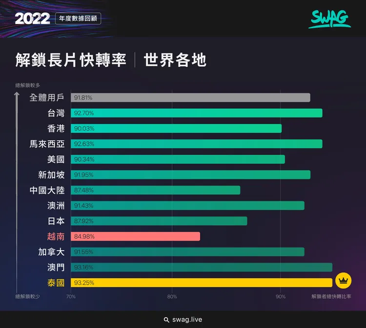 五、亞洲最大成人直播平台 SWAG公布 2022 年總回顧,長片觀看中有 57.8 億秒被快轉,等於全球觀眾省了 183 年,只為更快達到高潮。