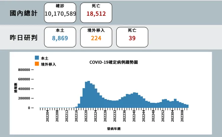 指揮中心說明,昨日(3/11)國內新增新冠肺炎確定病例9093例,分別為8869例本土病例及224例境外移入,其中本土8869例較上周日公佈1萬90例,減12.1%;另確診個案中新增39例死亡。