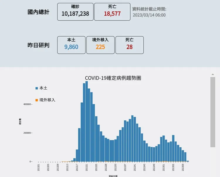 中央流行疫情指揮中心今日公布,昨日(3/13)新增本土9860例、境外移入225例、死亡28。新冠肺炎爆發至今,國內累計確診1018萬7238例確診、18577例死亡。