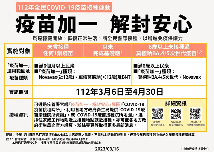 此外,指揮中心說明,3月6日「疫苗+1」運動上路以來,截至15日約有19.8萬人次;6歲以上民眾接種莫德納BA.4/5次世代疫苗部分,自1月1日以來累積接種約173.4萬人次,平均每天約2.3萬人次,這部分還需要再努力,且近期死亡個案中仍有半數以上未接種任何一劑疫苗,提醒民眾儘速接種。