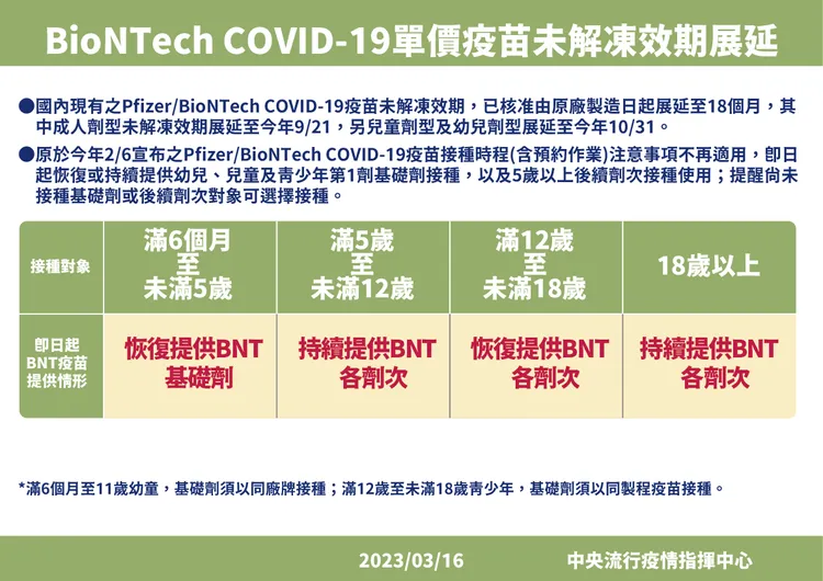 指揮中心原於今年2月6日宣布請民眾留意之Pfizer/BioNTech COVID-19疫苗接種時程(含預約作業)注意事項不再適用,即日起恢復或持續提供幼兒、兒童及青少年第1劑基礎劑接種,以及5歲以上後續劑次接種使用;提醒尚未接種基礎劑或後續劑次對象可選擇接種。