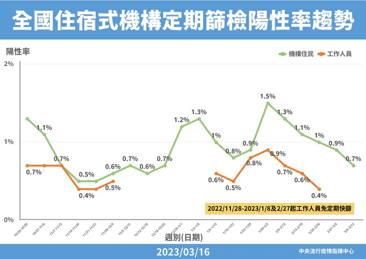 羅一鈞接著提到,長照機構住民陽性率,3/6至3/12為0.7%,較2/27至3/5的0.9%持續下探,目前來講是第三波Omicron疫情最低點,另機構住民快篩持續到3/31,將針對陽性率評估,下周宣布是否持續延長。