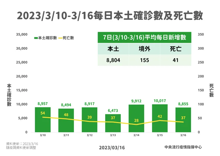 指揮官王必勝則說,今年第10周總病例數為6萬4558人次,較第9周下降17.%,整體疫情呈現穩定下降,且幾乎降到1年來的最低點。另3月10日至16日本土確診統計,平均每天新增8804例。