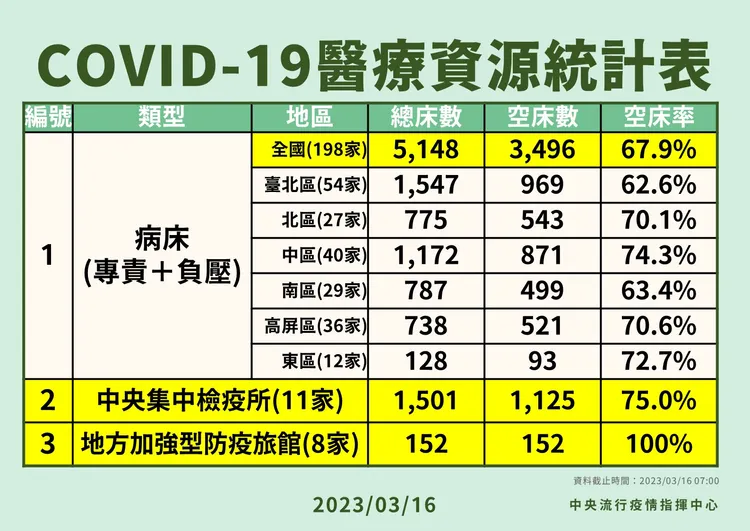 COVID-19醫療資源最新統計,指揮中心發言人羅一鈞表示,目前六區專責病床空床率都在六成以上甚至可達七成,昨日醫療應變組開會討論,進一步調整專責病房開設率,500床以上醫院開設率從現行3~5%,調降為2~4%;200~499床開設率從2%~5%,一併調降為2~4%,換言之,開設率上限從現行5%調降為4%。