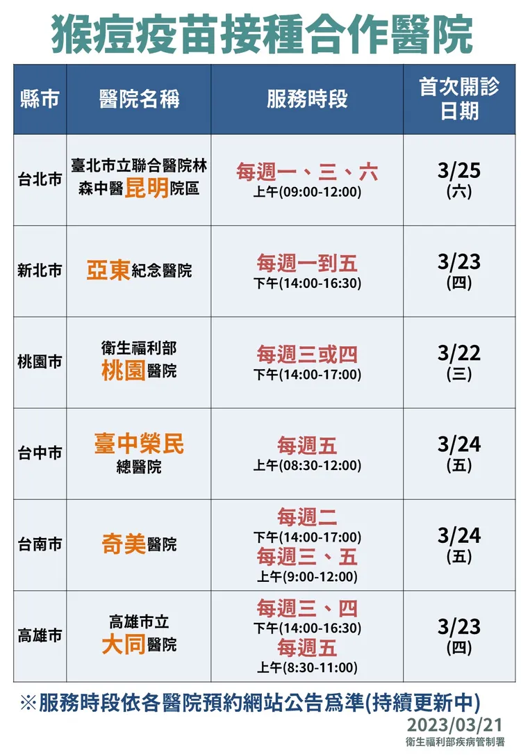 針對猴痘疫苗接種,羅一鈞指出,第一階段曝露前預防接種將採「集中接種」及「皮內注射」方式進行,目前庫存尚有1091瓶猴痘疫苗,粗估可供逾3200人使用,扣除保留給接觸者與實驗室的劑量,第一階段預計提供2500人接種,並先以六個直轄市各設置一家合作醫院為先,包括北市聯醫林森中醫昆明院區、亞東紀念醫院、部立桃園醫院、台中榮總、奇美醫院、高雄市立大同醫院等。