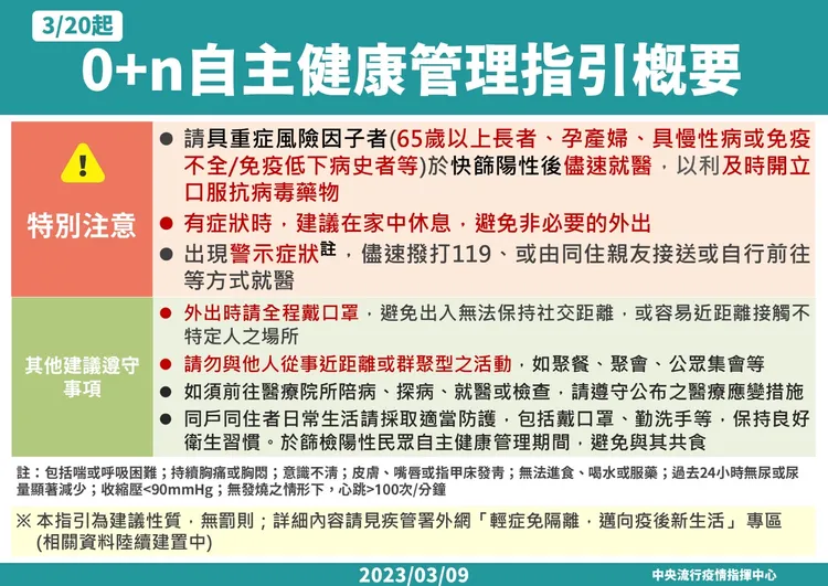 指揮中心提醒,COVID-19篩檢陽性輕症民眾已免隔離,請配合「0+n自主健康管理」,自主健康管理期間快篩陰性,或至距離發病日或採檢陽性日已達10天無需採檢,即可解除。自主健康管理期間,建議外出時請全程佩戴口罩;有症狀時在家休息,避免不必要外出,無症狀或症狀緩解(退燒至少1天)後可安心外出。