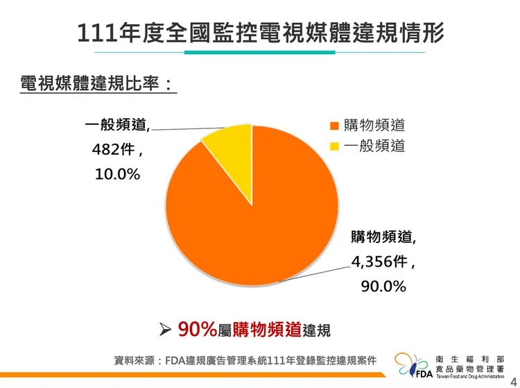 衛福部食藥署今(3/22)公布,統計去年度全國衛生機關監控食品、藥物、化粧品違規廣告,當中裁處金額最多為電視廣告,共計裁處1億2581萬元,其中1961件食品相關、佔65%;進一步分析,購物台廣告占90%為最大宗,主要違規的電視頻道則依序為為東森購物台系列(佔51%)、momo購物台系列(佔21%)及VIVA購物1台(佔13%)。