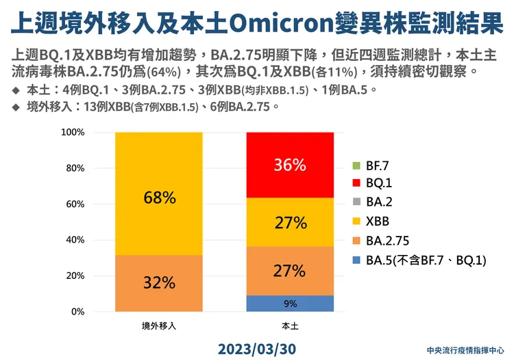 指揮中心發言人羅一鈞指出,上周本土病例檢出4例BQ.1、3例BA.2.75,3例XBB(均非XBB.1.5)、1例BA.5。境外移入檢出13例XBB(含7例XBB.1.5)、6例BA.2.75。BQ.1暫居領先,BA.2.75明顯下降。