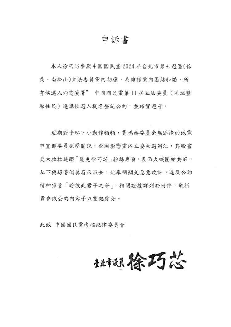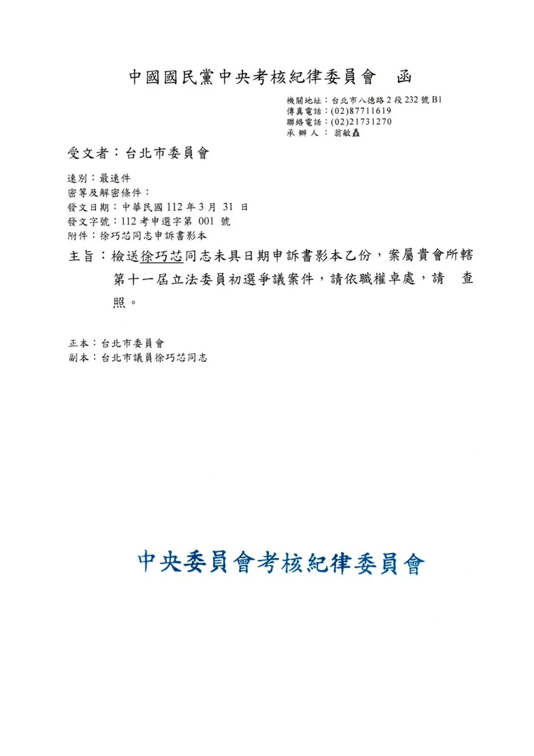 申訴書最後指出,前述相關證據詳列於附件,希望委員會依照公約內容予以黨紀處分,中央考紀會則在3/31發文給台北市委員會,要求依職權卓處。