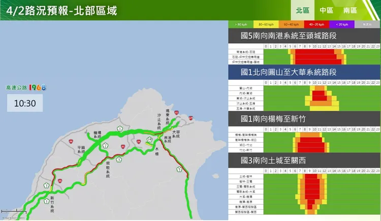 因應可能出現的壅塞狀況,高公局建議,西部國道南向用路人儘量6時前或12時後出發;國5南向用路人建議5時前或17時後出發,另國5北向用路人建議於9時前出發,節省寶貴時間。