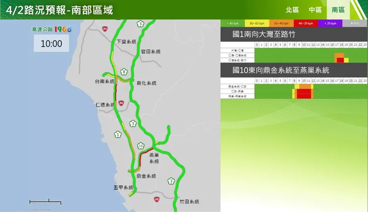 高公局發布新聞稿說明,今天國道預估交通量為120百萬車公里,為平日年平均(90百萬車公里)的1.3倍,其中南向交通量可達62百萬車公里,為平日年平均的1.4倍。