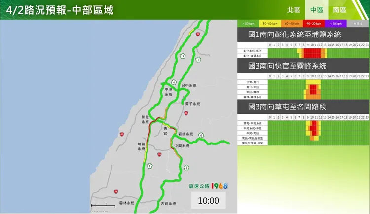 針對用路人關心的重點壅塞路段,高公局預判將為國1南向楊梅-新竹、彰化系統-埔鹽系統、北向圓山-大華系統;國3南向土城-關西、快官-霧峰;國5南向南港系統-頭城、北向宜蘭-坪林;國10鼎金-燕巢等。