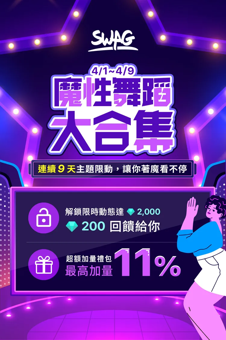 SWAG趁連假也推出「魔性舞蹈大合集」,4/9前主題限動,讓你著魔看不停!解鎖限時動態達2,000鑽,再回饋200鑽,更有超額加量禮包,最高加量11%!