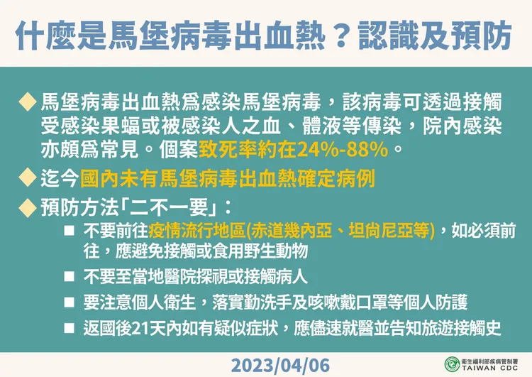 疾管署進一步指出,迄今國內未有馬堡病毒出血熱確定病例。馬堡病毒可透過接觸受感染果蝠或被感染人之血、體液等傳染,院內感染亦頗為常見,症狀為突發高燒、嚴重頭痛與倦怠、肌肉痛等;通常於發病後3-5天出現全身紅疹,伴隨嚴重腸胃道症狀,5-7天起多有嚴重出血現象伴隨持續高燒,並多於8-9天後因失血休克死亡,致死率介於24-88%,目前尚無有效疫苗可供預防接種。