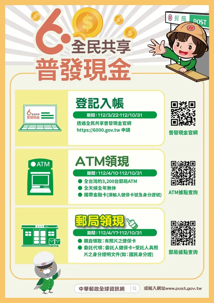 中華郵政稱,為便利民眾領取普發現金6000元,呼籲民眾下載「行動郵局」APP,於登入頁面點選「全民共享普發現金」官方LOGO, 即進入「登記入帳」、「ATM 領現」及「郵局領現」3 種領取方式引導頁面。