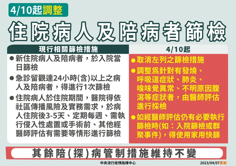 另指揮中心強調,其餘陪(探)病管制措施維持不變,全國醫院住院病人陪病人數仍以1人為限,但病人為兒童(12歲以下)、老人(65歲以上)、身心障礙或經醫療機構評估有照護需求者(如行動不便、生活無法自理等),陪病人數上限為2人;訪客探病每日固定1時段,每名住院病人每次至多2名訪客為限,但因應病人病情說明或病危探視等例外情形探病時段及訪客人數不在此限。