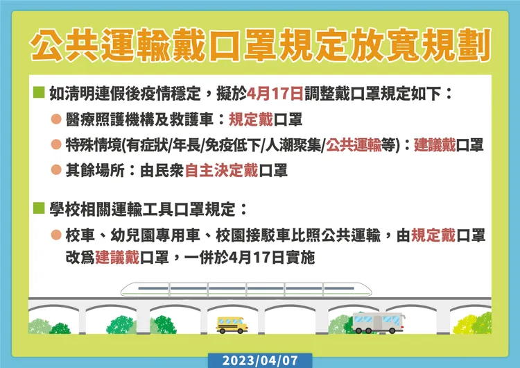 經綜合評估與跨部會溝通研議後,如疫情持續穩定可控,自4月17日實施公共運輸戴口罩放寬之通案性規定。放寬措施為通案性規定,相關細節得另依主管機關規定辦理。