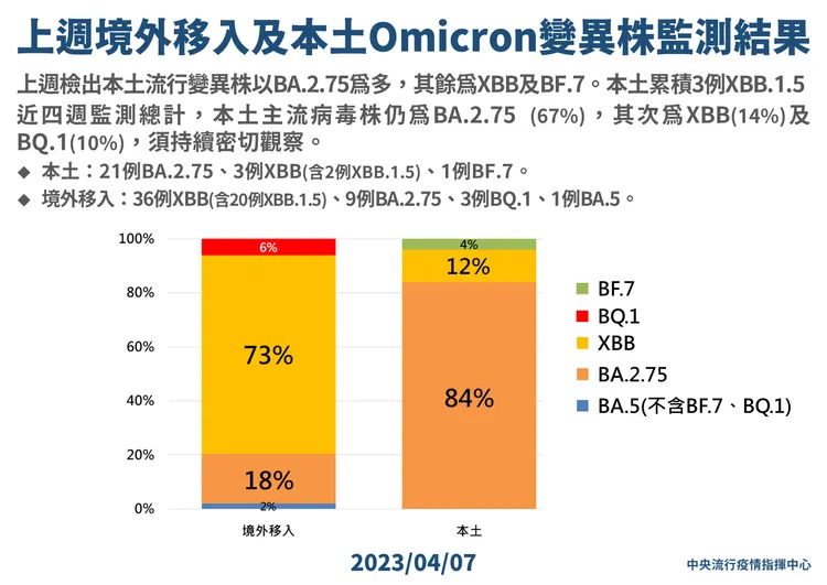 至於變異株監測,上周新增檢出74例Omicron亞型變異株確定病例。其中25例本土個案分別為21例BA.2.75、3例XBB (含2例XBB.1.5)、1例BF.7;另49例境外移入分別為36例XBB (含20例XBB.1.5)、9例BA.2.75、3例BQ.1、1例BA.5。