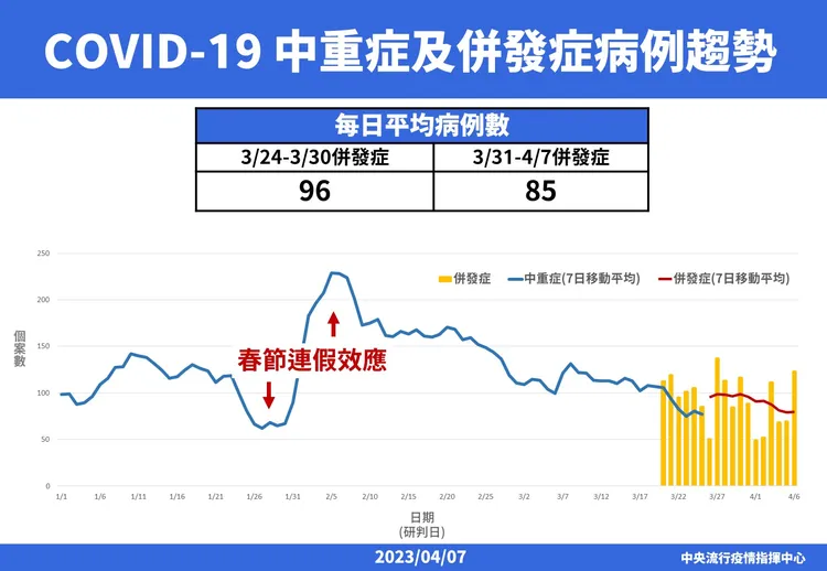 指揮中心說明,全國疫情持續下降,重症及死亡個案多具慢性病史且未接種滿3劑疫苗,呼籲長者等重症高風險族群疫苗接種與及早用藥,並持續監測防疫措施鬆綁後對疫情影響及變異株變化。