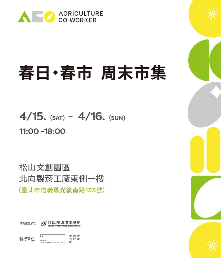 今明(4/15、4/16)在松菸文創園區舉辦的「春日・春市」周末野餐市集,展現農產電子商務包裝及品牌輔導成果,民眾可以品嘗臺灣各地風味美食,也能採購由產地直送的新鮮農產品。