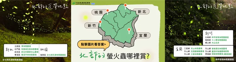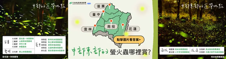 農委會也整理出全台賞螢地圖(tinyurl.com/tkmyj3ac),北、中、南、東部都有,只要點擊圖中螢火蟲,便可掌握當地賞螢資訊,民眾可多加利用。
