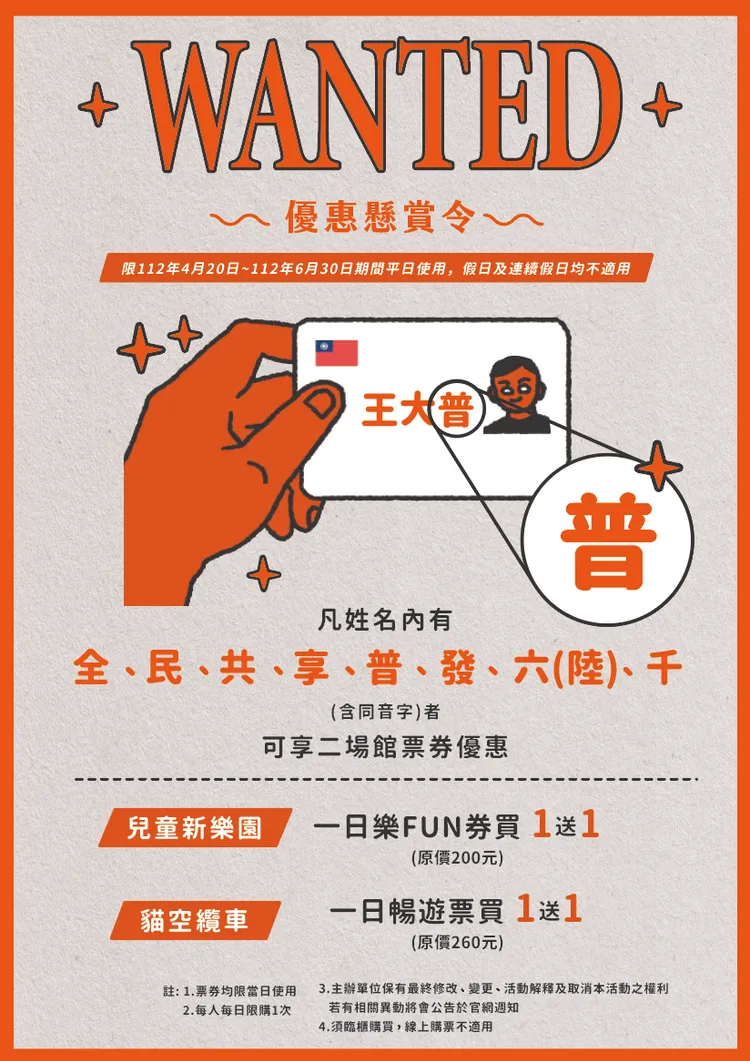 活動期間內,凡姓名內有「全、民、共、享、普、發、六(陸)、千」同字或同音字,購買兒童新樂園原價200元「一日樂FUN券」,可享買一送一優惠。票券限當日使用,每人每日限購1次,園區13項大型遊樂設施不限次數一票暢玩到底。