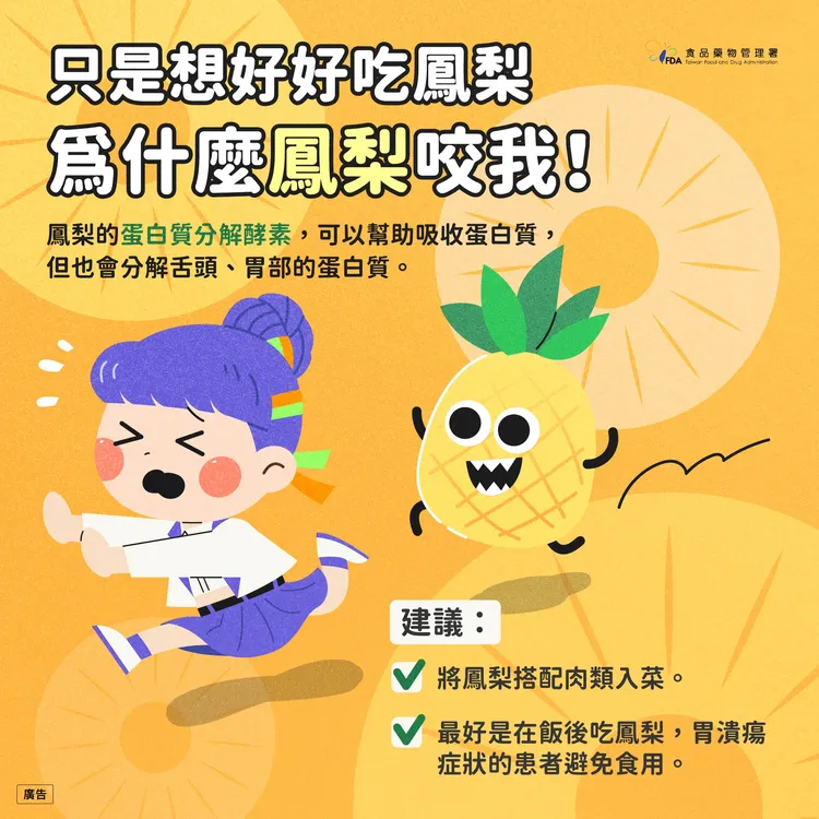 食藥署說明,鳳梨的蛋白質分解酵素可助蛋白質分解,但舌頭、胃部其實是由蛋白質組成,所以此酵素可能造成傷害,建議不要在空腹期間吃鳳梨,有胃潰瘍症狀者也最好別吃。