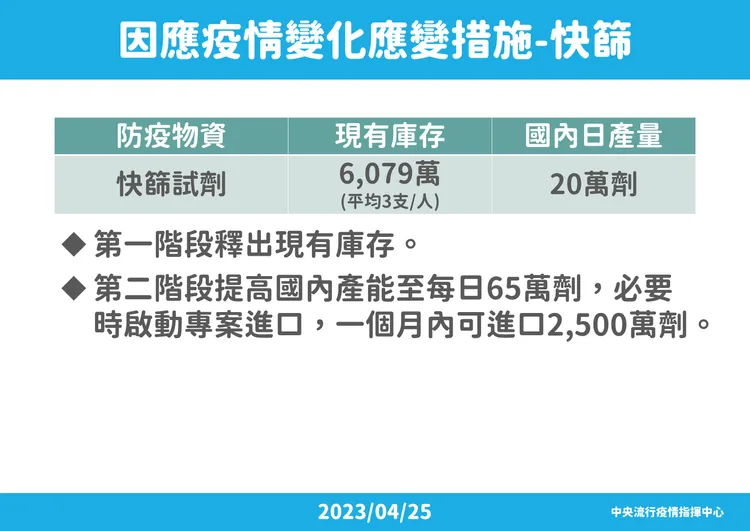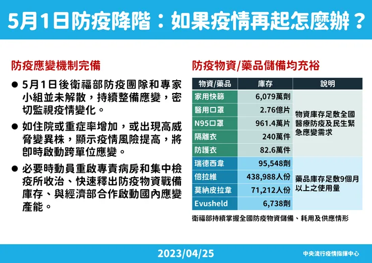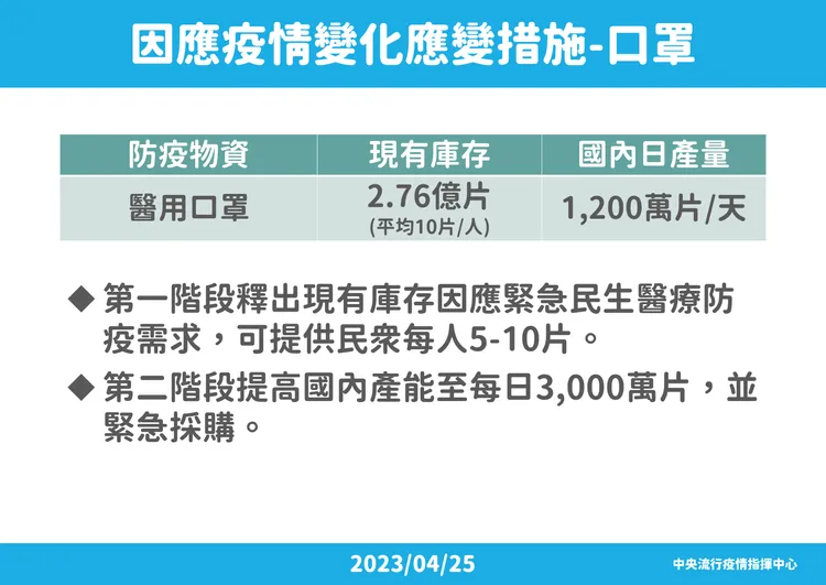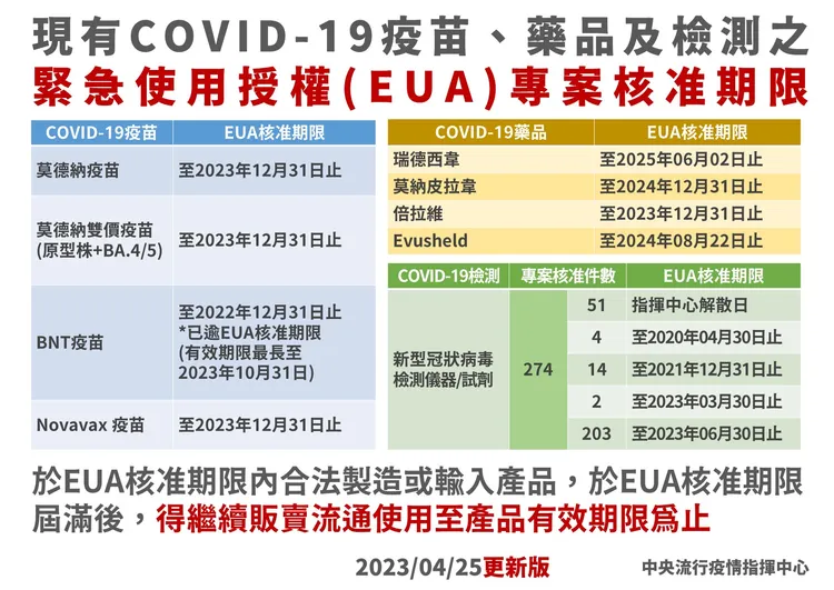 指揮官王必勝則補充,指揮中心解編、緊急授權失效等問題,多數產品都有明確效期,與指揮中心解散與否無關,且緊急授權到期是不能專案製造、專案輸入,民眾已經買的、已經持有的、市面上已經在流通的產品,使用前注意有效期限即可。