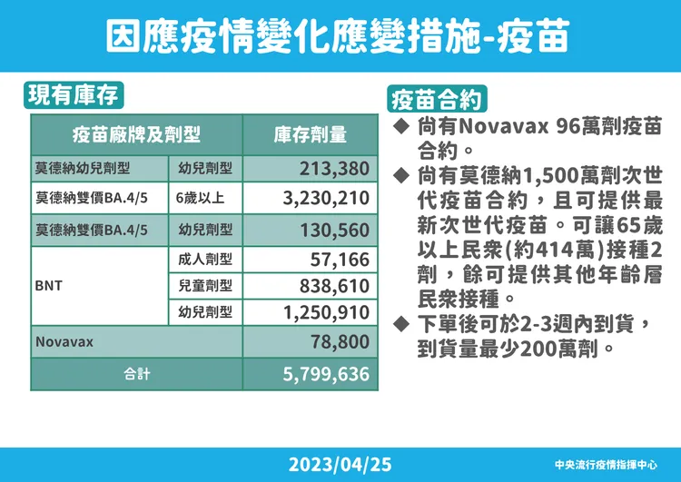 另莊人祥指出,目前持有的疫苗庫存上有580萬劑左右,Novavax尚有96萬劑,莫德納仍有1500萬劑次世代疫苗合約,可供65歲以上民眾接種兩劑,也可以提供給其他年齡層,下單後2到3週內可以到貨。
